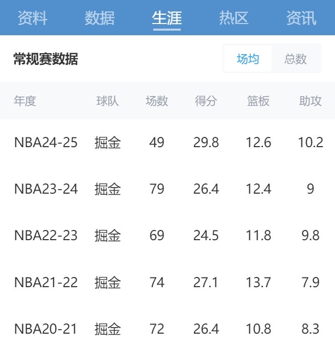 能維持住嗎?約基奇半程29.8+12.6+10.2 前年離場均3雙僅差0.2助