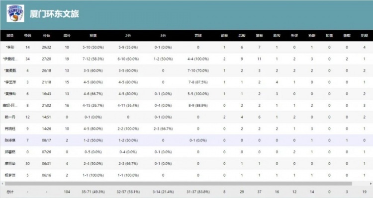 但與此同時,廈門女籃進攻持續(xù)性依然保持不錯,四節(jié)得分皆20+;全場保持進攻侵略性,半場就得到28次罰球,而對手僅12次;次節(jié)防守端發(fā)力同時自己砍下30分反超比分;第三節(jié)僅讓對手拿到8分,并直接拉開27分領(lǐng)先,最終輕松獲勝。廈門女籃全場僅12次失誤遠遠低于對手的22次。整場比賽,廈門環(huán)東文旅7人得分上雙。國內(nèi)球員發(fā)揮依然亮眼,李藝萍突破加造殺傷效率奇高,全場拿到17分;李彤、黃柔甄、黃雅玲和肖婉鈺也都得分上雙。內(nèi)線強點伊曼妮輕松砍下19分11籃板;馬丁也是殺傷力十足拿到16分。球隊首次常規(guī)時間得分破百,客場雙殺天津,圓滿結(jié)束本賽季。希望廈門女籃下賽季再接再厲,爭取更好的成績!