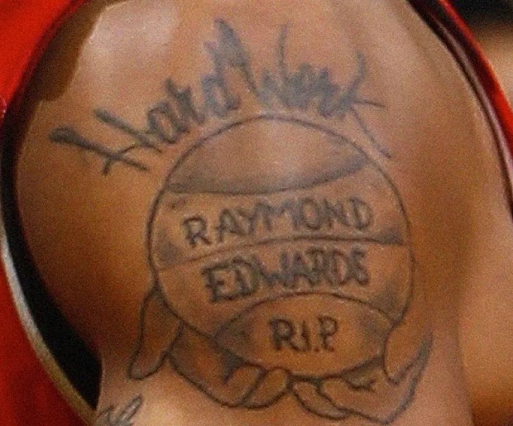 “如果我不打籃球的話,舅舅不會開心的。同時,我要承擔起責任,成為一家之主?!彼诩绨蛏衔牧艘粋€文身,在一雙祈禱的手上,刻著“努力工作”這幾個字,雙手握著一個籃球,籃球上寫著,“雷蒙德-愛德華茲,RIP”,努力工作、祈禱和籃球,這是他和舅舅之間,最牢不可破的紐帶。