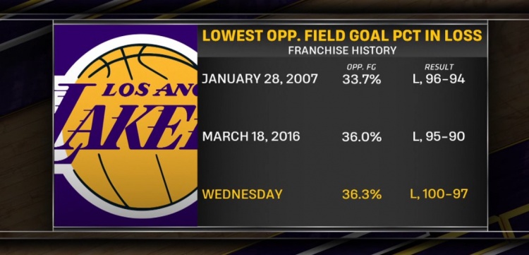 轉(zhuǎn)播方曬出數(shù)據(jù),這是湖人隊(duì)史輸球時(shí)對(duì)手投籃命中率第三低的紀(jì)錄。