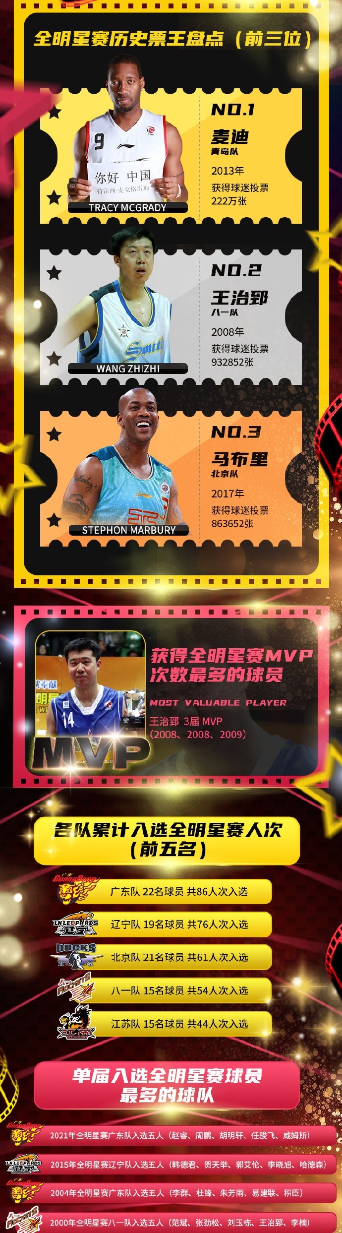 其中,全明星賽個(gè)人單場(chǎng)得分紀(jì)錄由比斯利(63分)保持,朱芳雨15次入選全明星冠絕聯(lián)盟,麥迪為全明星賽歷史票王。