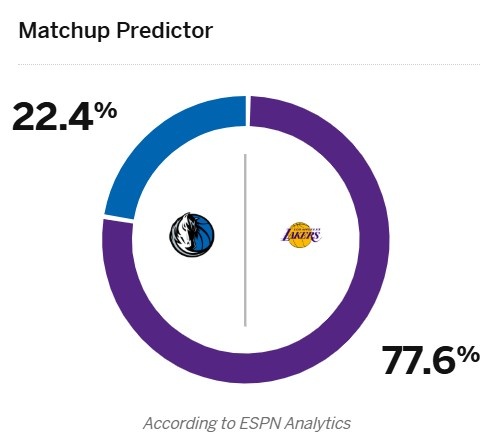ESPN預(yù)測了本場比賽勝率,其中主場作戰(zhàn)的湖人勝率高達77.6%,獨行俠為22.4%。
