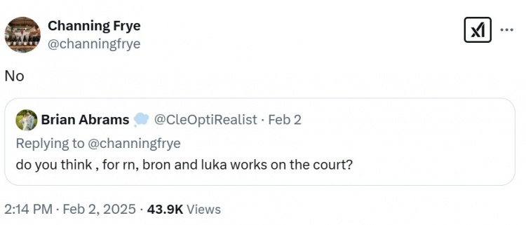 詹姆斯的前隊友錢寧-弗萊回答網(wǎng)友問答,當(dāng)被問及勒布朗和東契奇的組合在場上能否奏效時,他的回答是不能。