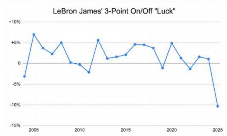 -10.3%的三分“運氣值”不僅對詹姆斯來說是一個異常值,對所有NBA球員來說也是如此。上一次有球員在至少1500分鐘的出場時間內(nèi)擁有更差的三分運氣值還要追溯到2010年,當時三分球的普及程度遠不如現(xiàn)在。換句話說,詹姆斯目前正在經(jīng)歷現(xiàn)代快節(jié)奏和空間化比賽中所有球員里最糟糕的三分運氣值。