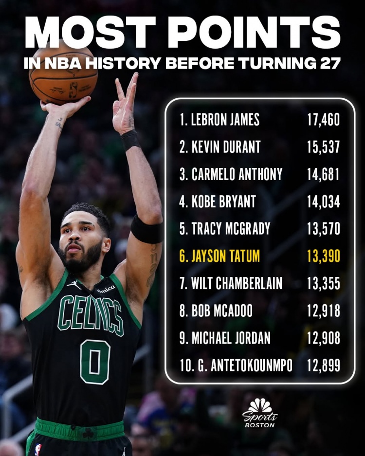 塔圖姆(26歲363天)在27歲前的總得分來(lái)到13390,超越張伯倫,暫列歷史第六。