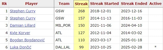 據統(tǒng)計,東契奇目前已經連續(xù)100場比賽有三分入賬,是歷史上第5位做到的球員。