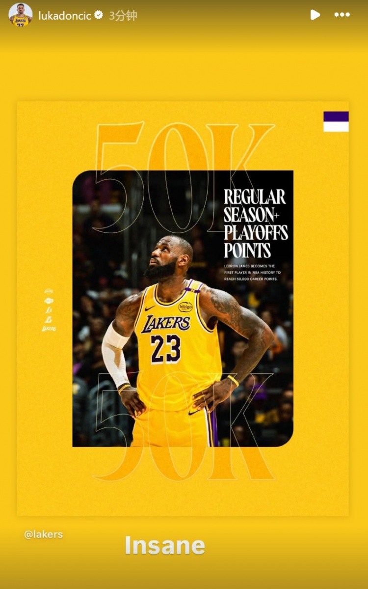 在本場比賽中,詹姆斯生涯總得分突破50000分;賽后,東契奇轉(zhuǎn)發(fā)了海報(bào)并評(píng)論道:“太瘋狂了?!?/p>