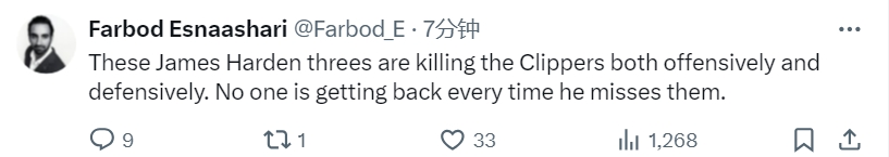 船記Farbod Esnaashari發(fā)推:“哈登這些三分球在攻防兩端都在殺死快船,當(dāng)他打鐵的時候,每個人都退不回來?!?/p>