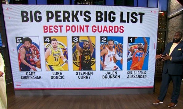 帕金斯列聯(lián)盟目前前5控衛(wèi):SGA、布倫森、庫里、東契奇、CC