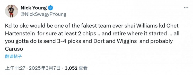 3月7日訊 今日前NBA球員尼克-楊發(fā)推談到了杜蘭特。