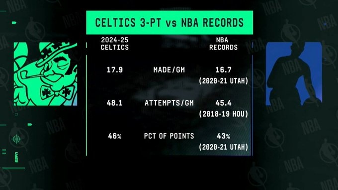 轉(zhuǎn)播方曬出一組本賽季凱爾特人和NBA歷史三分?jǐn)?shù)據(jù)的對(duì)比: