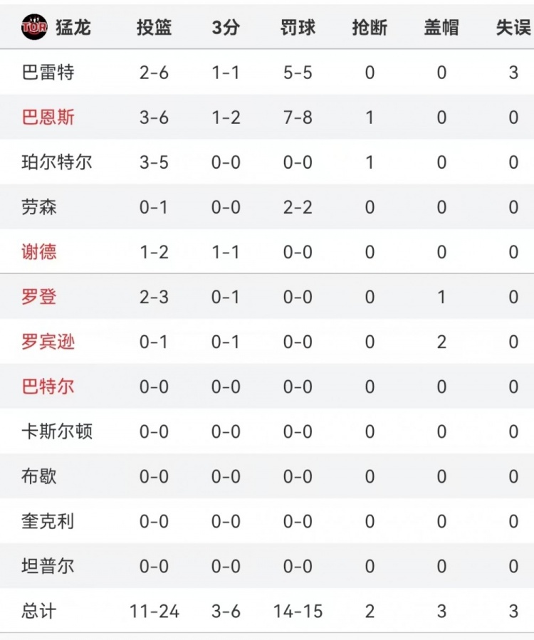 猛龍首節(jié)堅決沖擊內(nèi)線頻頻獲得罰球,并且罰球命中率非常不錯,全隊15次罰球機(jī)會,罰進(jìn)14球。其中巴恩斯8罰7中,巴雷特5罰5中。