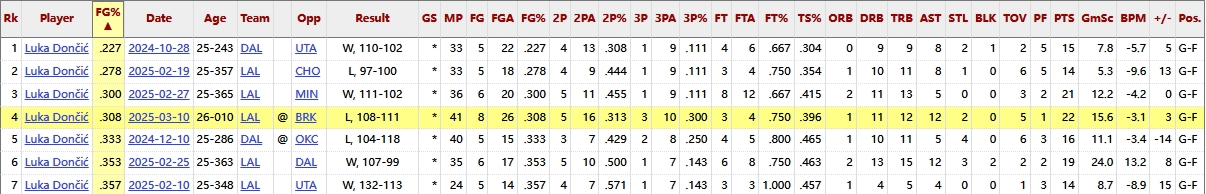 此役,東契奇30.8%的命中率創(chuàng)下了本賽季他個人的第四低。值得一提的是,在他本賽季命中率最低的7場比賽中有5場是在轉(zhuǎn)會至湖人后打出的。