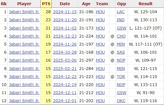 據(jù)統(tǒng)計,賈巴里-史密斯本賽季得分15+的比賽火箭12勝1負,只輸給勇士。