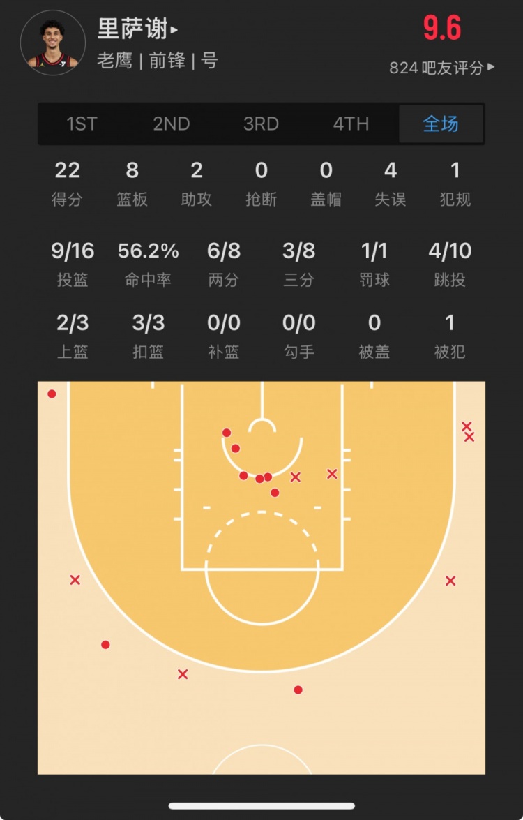 老鷹狀元秀 扎卡里-里薩謝 登場31.3分鐘