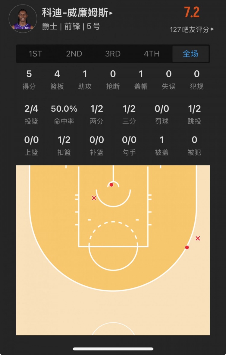 爵士10號秀 科迪-威廉姆斯 登場16.3分鐘