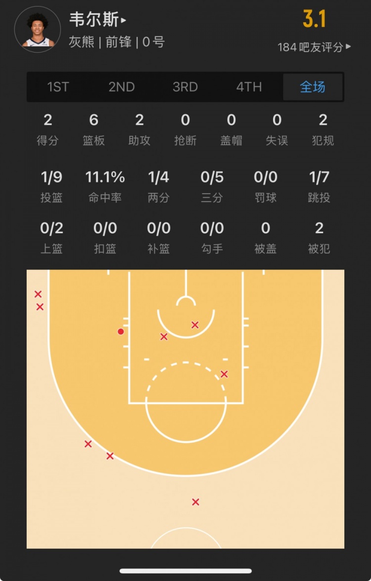 灰熊39號秀 杰倫-韋爾斯 登場23.3分鐘
