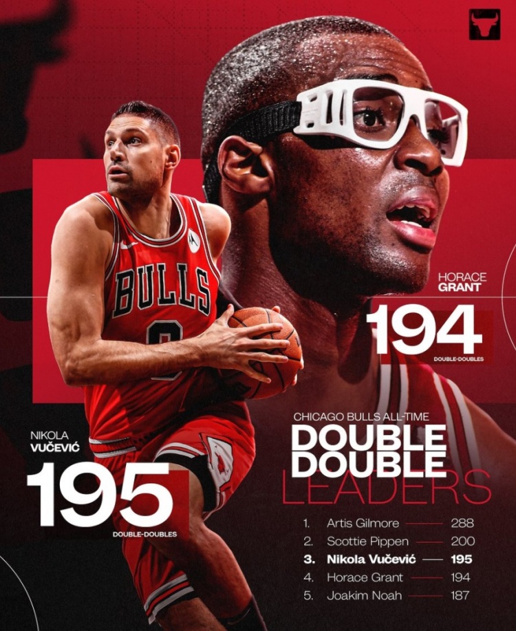 目前,武切維奇已經(jīng)得到了11分11籃板的兩雙數(shù)據(jù),他在公牛生涯的兩雙數(shù)來到195次,超越霍勒斯-格蘭特,上升至隊史第三位,僅次于皮蓬和阿蒂斯-吉爾摩爾。