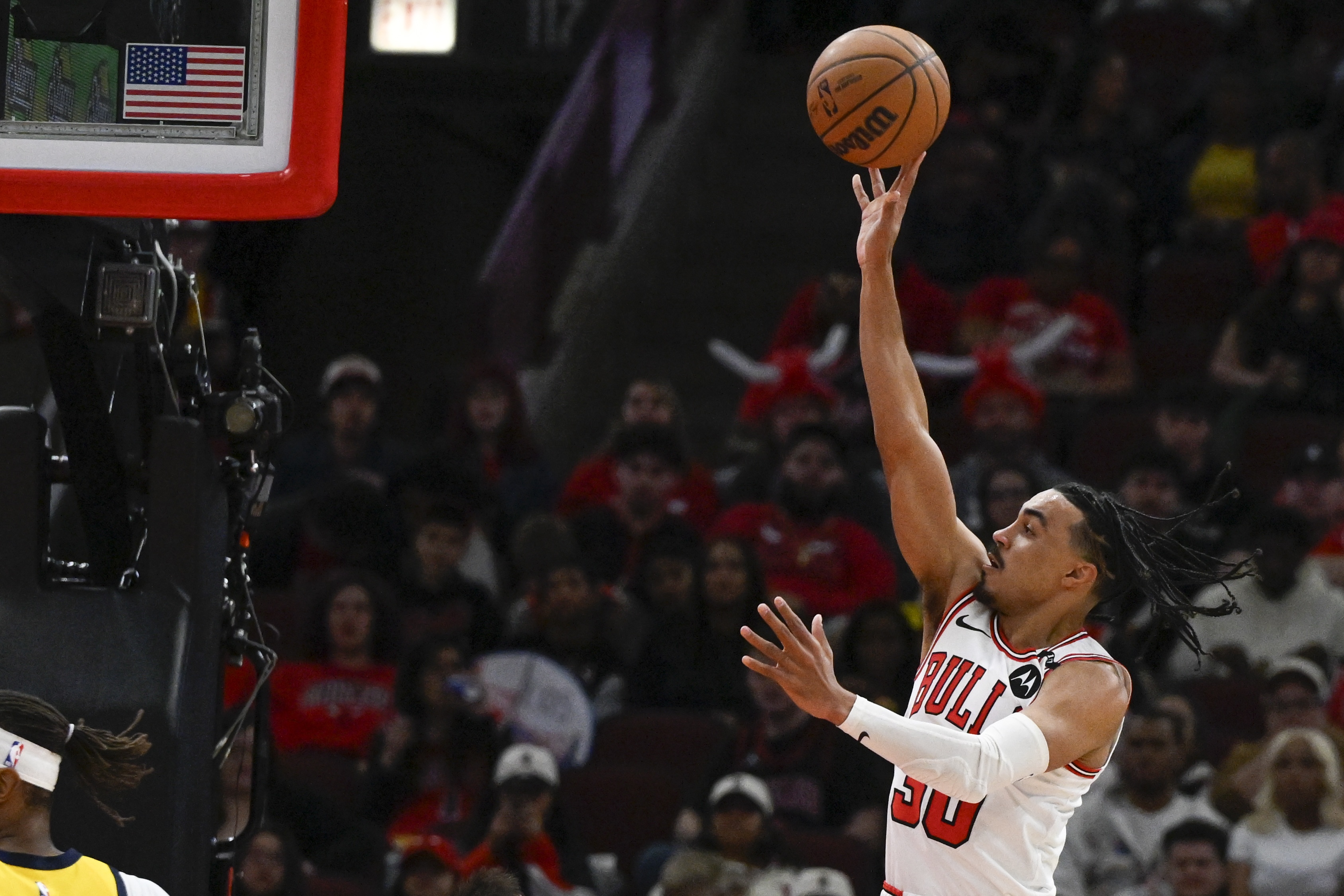 上半場(chǎng)比賽,公牛后衛(wèi)特雷-瓊斯發(fā)揮十分不錯(cuò),進(jìn)攻端里突外投很高效,且能串聯(lián)球隊(duì),他6中5,三分1中1,罰球2中1砍下12分1籃板5助攻。
