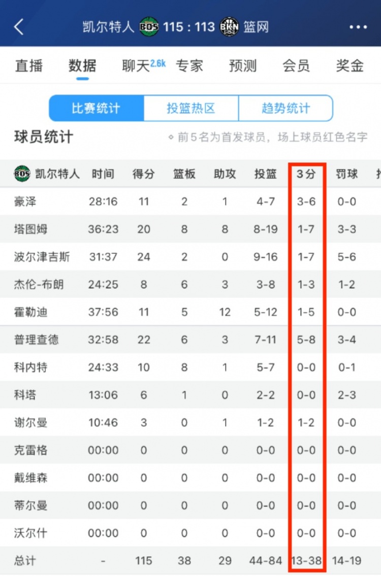 本場(chǎng)比賽,凱爾特人全隊(duì)三分整體來(lái)說(shuō)有些失準(zhǔn),38投13中,命中率僅34.2%;除了普理查德(8中5)和豪澤(6中3)正常發(fā)揮外,其余人皆失常,僅24中5。