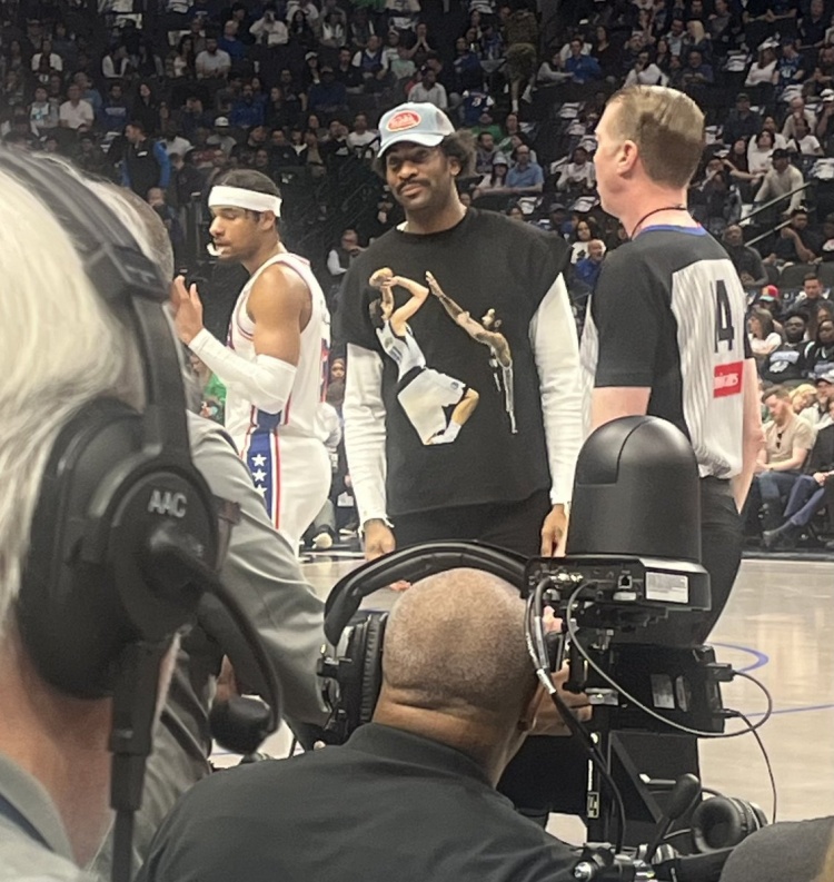 76人內(nèi)線德拉蒙德今天穿著一件印著諾維茨基迎著鄧肯金雞獨(dú)立圖案的T恤,向這名獨(dú)行俠傳奇致敬。