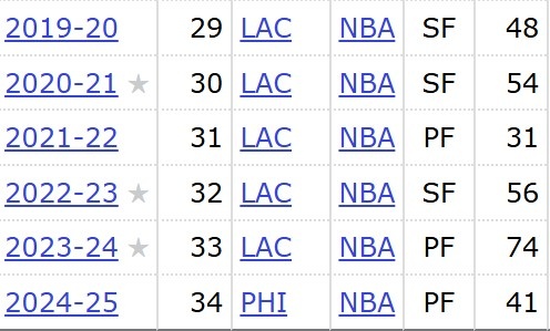 據(jù)統(tǒng)計(jì),本賽季喬治出戰(zhàn)41場(chǎng),是他自2021-22賽季以來出戰(zhàn)最少的一個(gè)賽季,近6年,他已經(jīng)5次出戰(zhàn)不足60場(chǎng),具體如下: