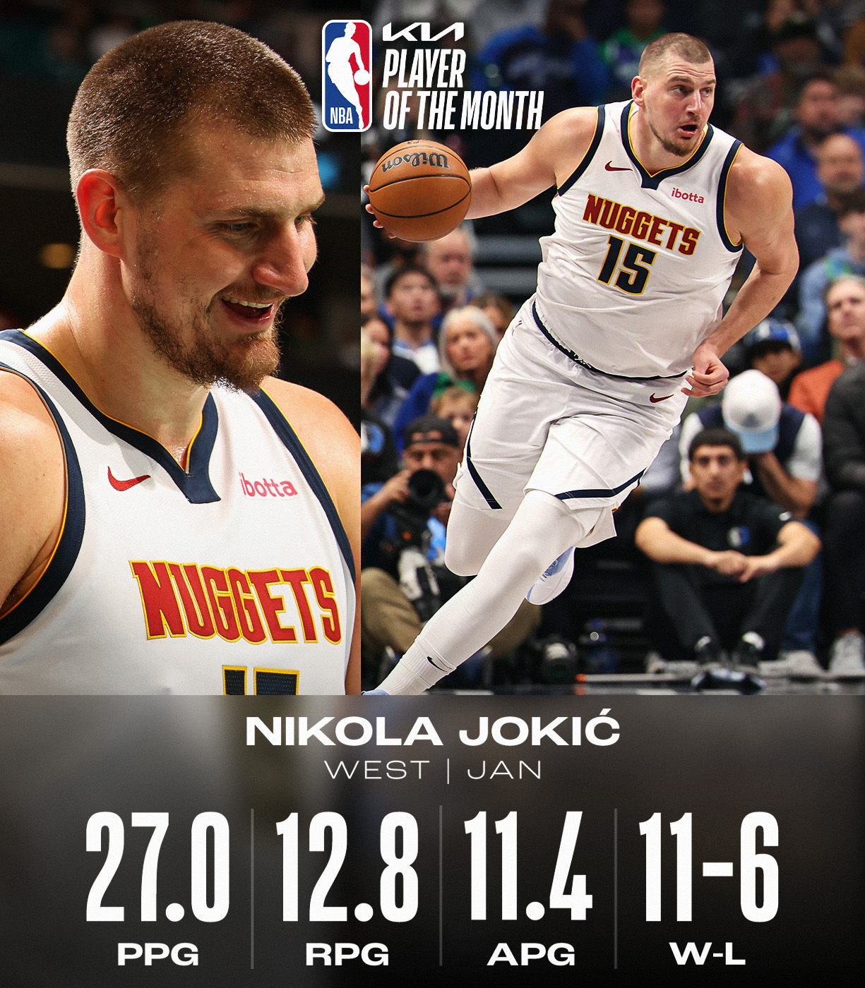 約基奇一月場均:27.0分12.8籃板11.4助攻,出戰(zhàn)的比賽掘金11勝6負(fù)!