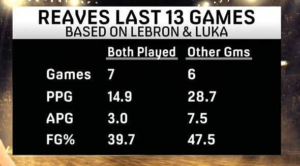東詹一起出戰(zhàn) 搭檔里夫斯共7場比賽 后者場均14.9分3助 命中率39.7%東詹有一人沒出戰(zhàn)/都沒出戰(zhàn) 里夫斯打了6場 場均28.7分7.5助????命中率47.5% 標(biāo)簽: 籃球 NBA 湖人 詹姆斯 東契奇