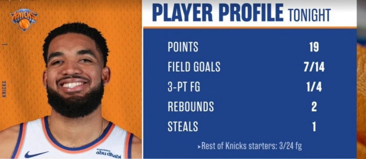 半場(chǎng)比賽,尼克斯首發(fā)除了唐斯以外都表現(xiàn)不佳,投籃共計(jì)24中3,共得到11分。