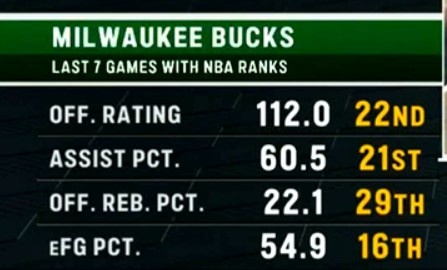 轉(zhuǎn)播方曬出一組數(shù)據(jù),在最近7場比賽中,雄鹿進(jìn)攻便秘: