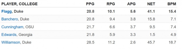 將弗拉格與最近四位來自大學(xué)籃球的NBA選秀狀元——錫安、愛德華茲、康寧漢姆、班凱羅的大一賽季數(shù)據(jù)進(jìn)行標(biāo)準(zhǔn)化對比(所有數(shù)據(jù)按每40分鐘的產(chǎn)量調(diào)整以確保公平性)。其中NET(凈效率)與BPM(基礎(chǔ)正負(fù)值)等高階數(shù)據(jù)能在一定程度上體現(xiàn)防守影響力: