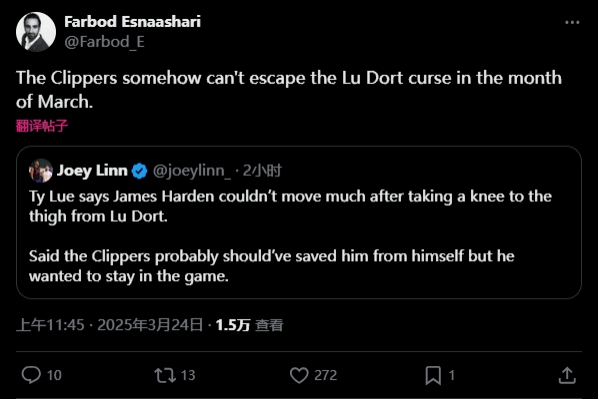 快船隊(duì)記Farbod Esnaashari發(fā)推表示:“快船在三月份似乎無(wú)法擺脫盧-多特的魔咒?!?/p>