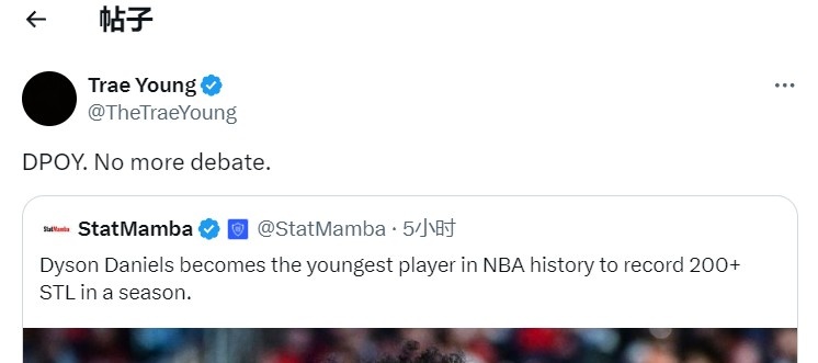 比賽結(jié)束后,老鷹球星特雷-楊轉(zhuǎn)發(fā)了丹尼爾斯的這一數(shù)據(jù),并在旁邊寫道:“年度最佳防守球員。停止爭論?!?/p>