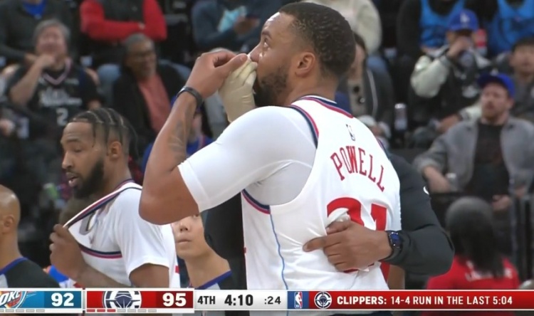真正的“血帽”!鮑威爾上籃遭亞歷山大封蓋 被打到鼻子血流不止