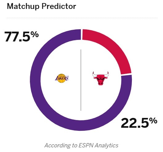 今天,ESPN預(yù)測(cè)本場(chǎng)比賽勝率,湖人77.5%,公牛22.5%。