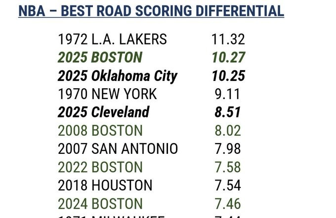 據(jù)統(tǒng)計(jì),本場比賽過后,凱爾特人的賽季場均客場凈勝分來到10.27,超越本賽季的雷霆(10.25),升至歷史第二位,僅次于1972年的湖人。