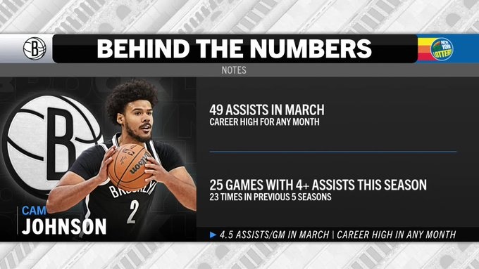 轉(zhuǎn)播方曬出一組數(shù)據(jù),籃網(wǎng)球員卡梅隆-約翰遜在3月已送出49次助攻、場(chǎng)均4.5次,這2項(xiàng)數(shù)據(jù)是他個(gè)人生涯的單月新高。
