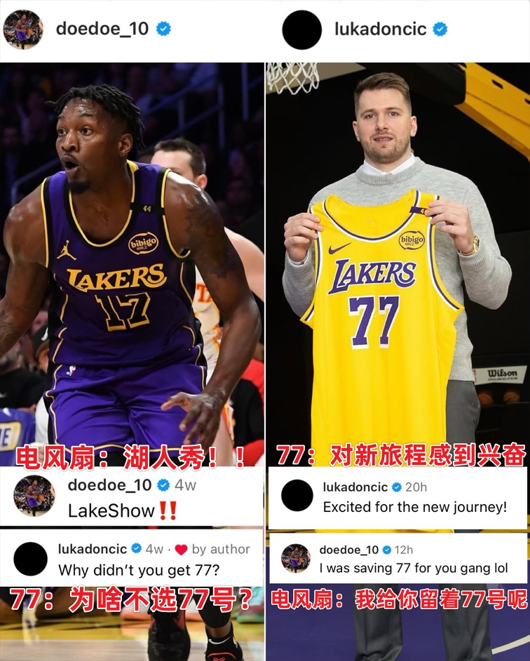 25年2月5日 東契奇被交易至湖人后發(fā)文:“對新旅程感到興奮!”電風扇評論:“77號給你留著呢!”
