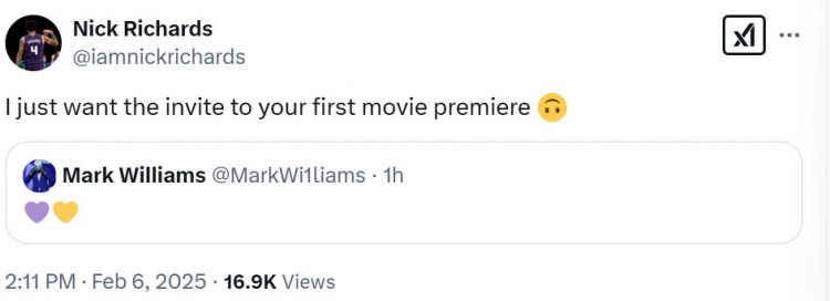 前隊友尼克-理查茲評論道:“我只想要你在湖人首秀的邀請?!?/p>