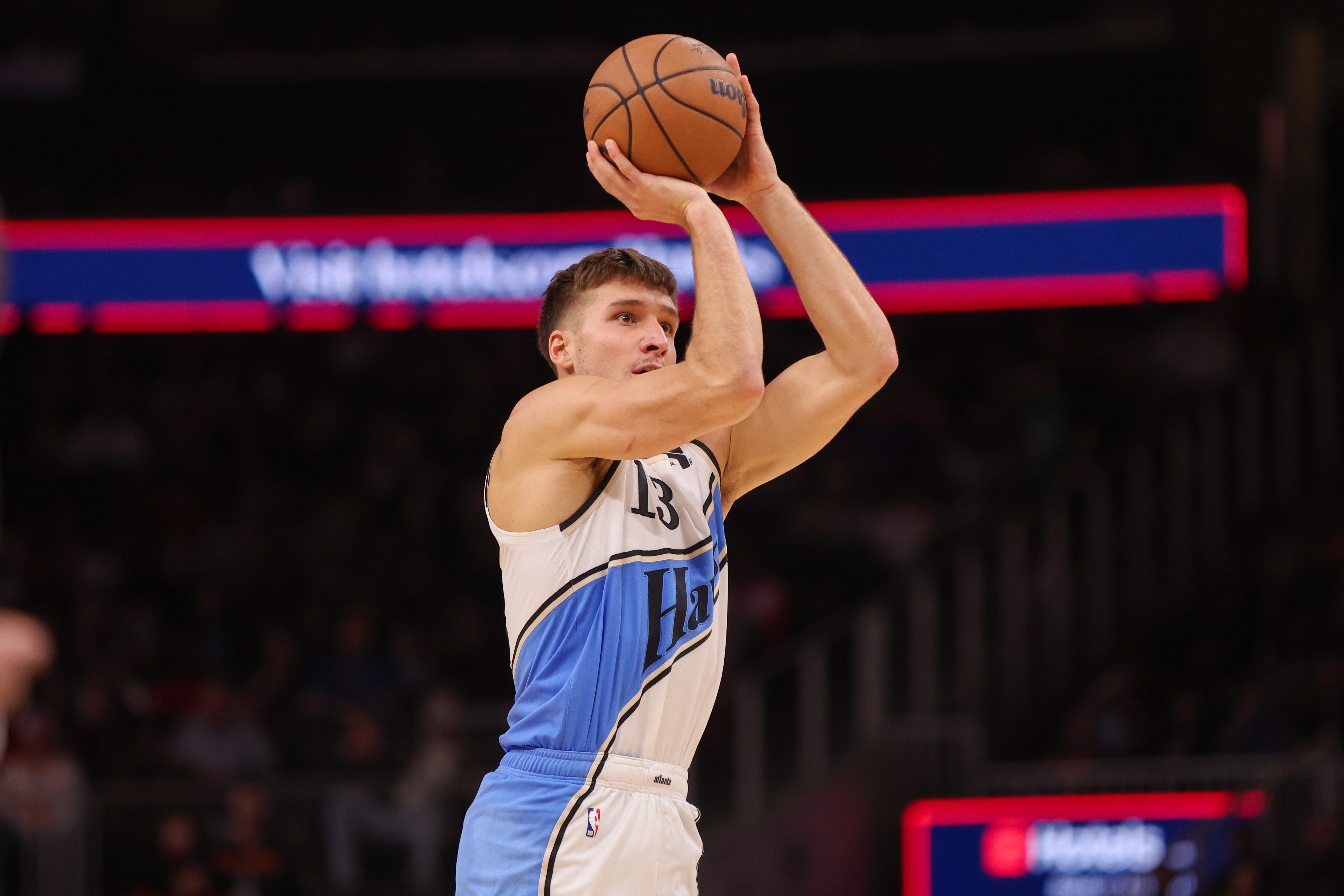 據(jù)統(tǒng)計(jì),這兩項(xiàng)數(shù)據(jù)均創(chuàng)博格丹生涯新低,其生涯三分命中率為38.0%,投籃命中率為43.5%。