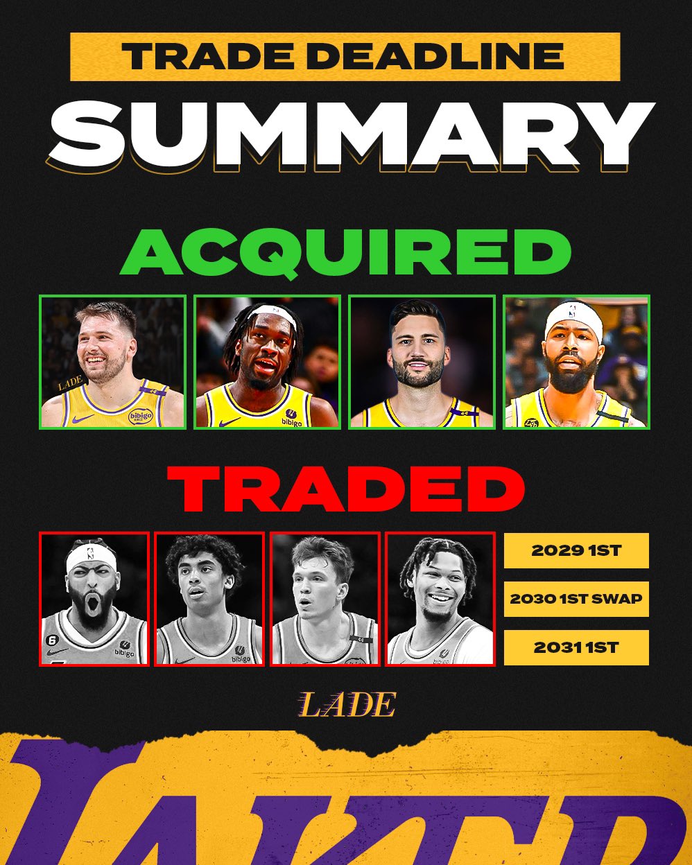 送出:拉塞爾、劉易斯、濃眉、克里斯蒂、席菲諾、克內(nèi)克特、雷迪什;29年&31年首輪簽、25年&27年&30年&31年次輪簽;30年首輪互換權。
