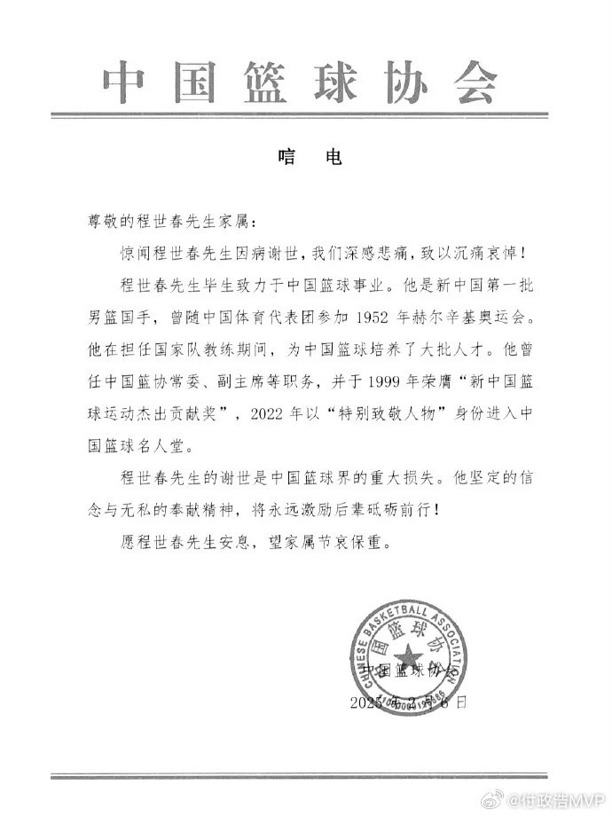 中國(guó)籃協(xié)前任副主席、原北京市體委副主任、新中國(guó)第一代國(guó)手程世春因病逝世,中國(guó)籃協(xié)向程世春協(xié)家屬發(fā)唁電慰問(wèn)。