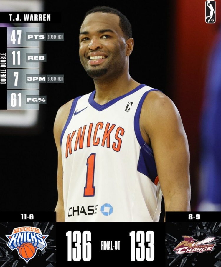 此役,TJ-沃倫出戰(zhàn)44分53秒,投籃23中14,三分13中7,罰球10中9,爆砍47分11籃板2助攻2搶斷1蓋帽,得分和三分命中數(shù)賽季新高。