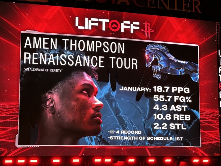 據(jù)統(tǒng)計(jì),火箭新星阿門-湯普森在1月場均能砍下18.7分10.6籃板4.3助攻2.2搶斷,投籃命中率55.7%。