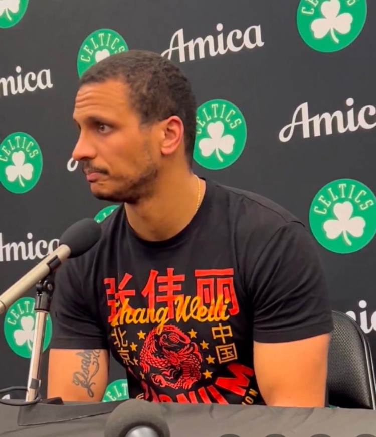 賽后,凱爾特人主帥馬祖拉在接受采訪時身穿印有“張偉麗”字樣的T恤接受采訪。