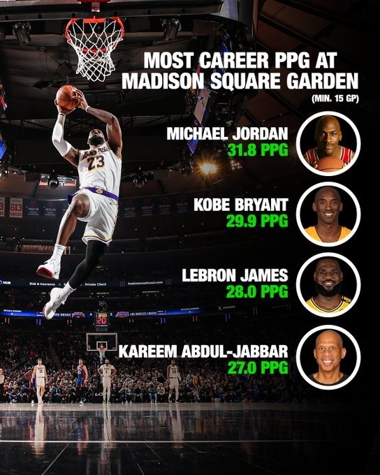 麥迪遜廣場花園生涯得分:喬丹31.8分居首 科比2詹姆斯3賈巴爾4