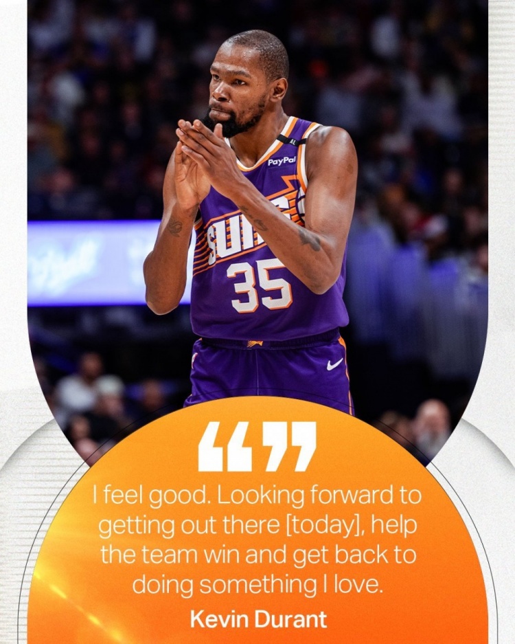 2月12日訊 今天上午11點,太陽主場迎戰(zhàn)灰熊,杜蘭特早些時候接受了媒體采訪。