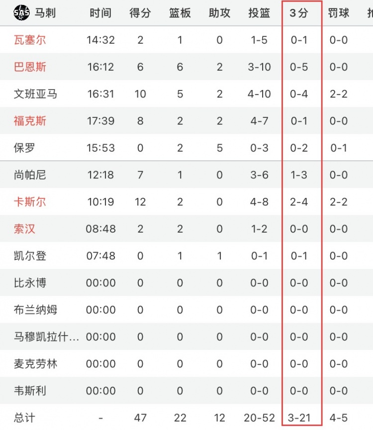 上半場(chǎng)比賽,馬刺外線全員失準(zhǔn),都沒(méi)有狀態(tài),全隊(duì)21投僅3中,命中率僅為14.3%...
