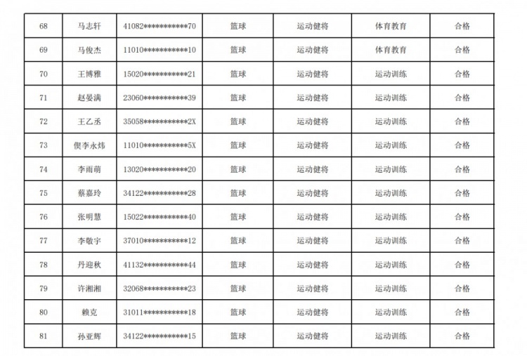 本次錄取名單中籃球項(xiàng)目共計(jì)17人,其中有多位CBA現(xiàn)役球員成績(jī)合格被錄取。參加本次考核并獲得合格成績(jī)的考生僅為通過(guò)學(xué)校資格初審,最終錄取名單以國(guó)家體育總局公示為準(zhǔn)。