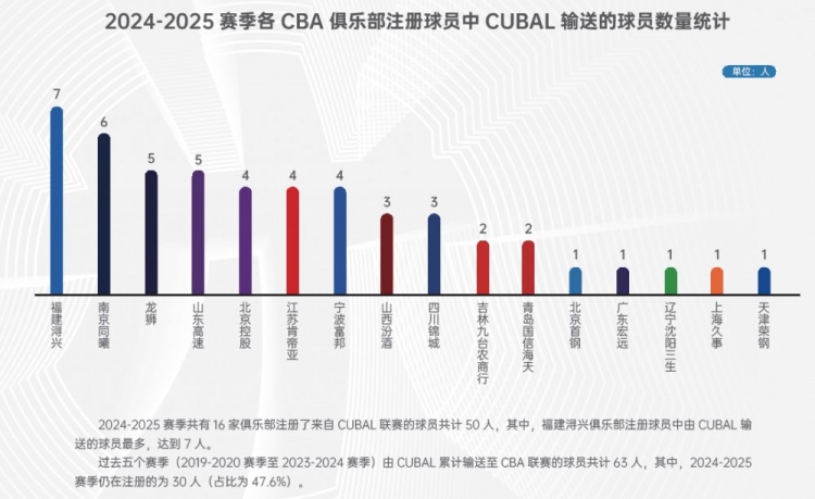 其中,本賽季各俱樂(lè)部中CUBAL輸送球員的統(tǒng)計(jì)情況如下。福建有7人最多、同曦6人第二,廣州和山東各5人。